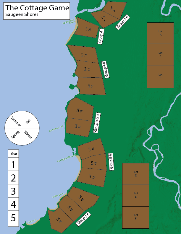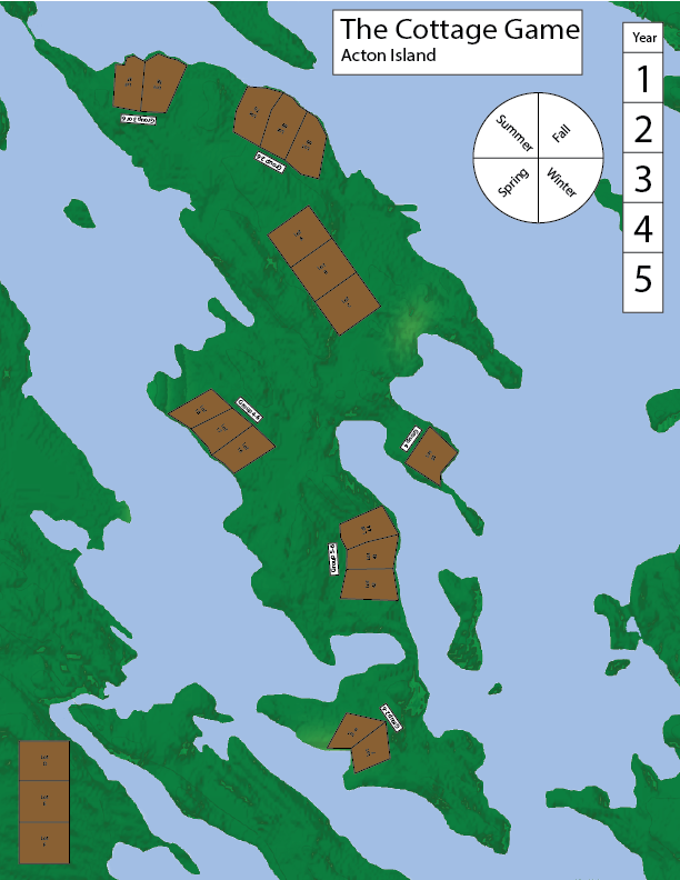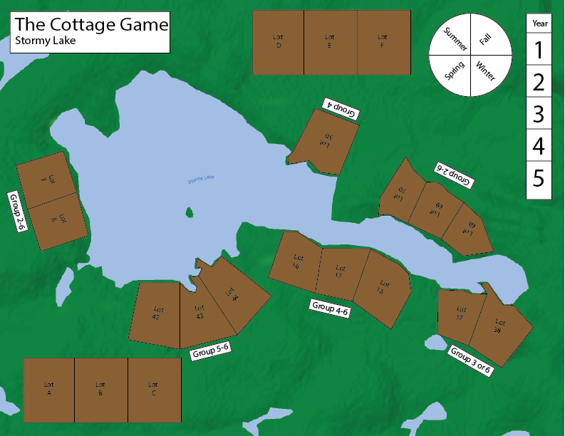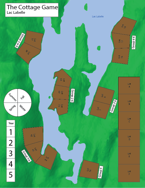 Players are Builders trying to be the first to build 3 Cottages on an Island, Lake or Shoreline. The playing board will include popular cottage areas and can even be customized to your cottage area!!