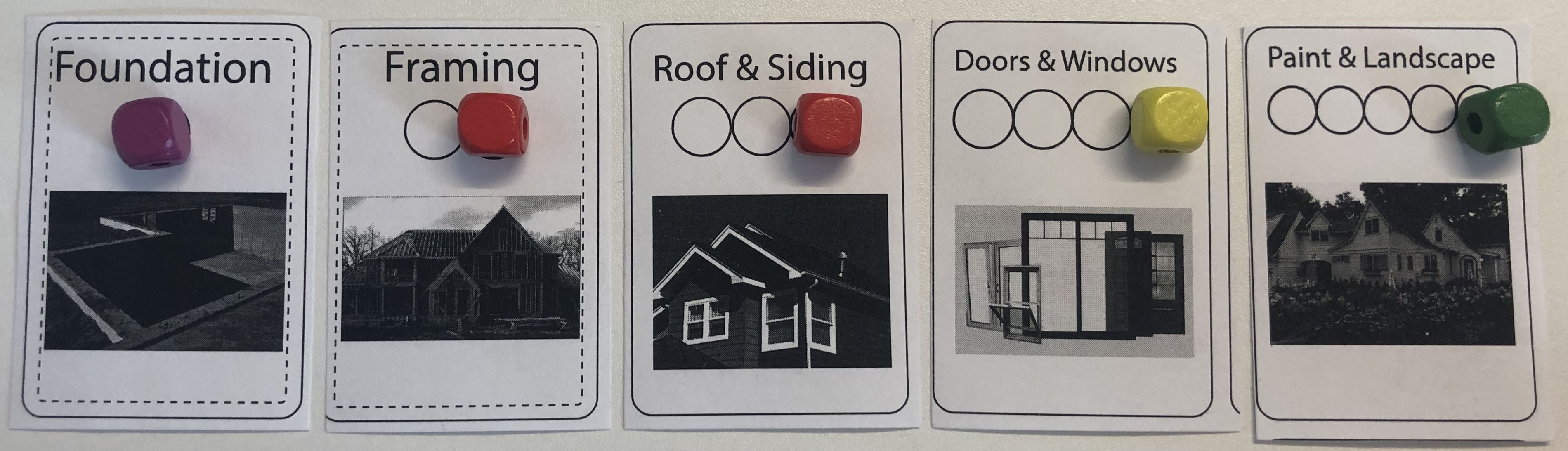 Tracking the 5 steps of building a cottage (shown with assigned values):