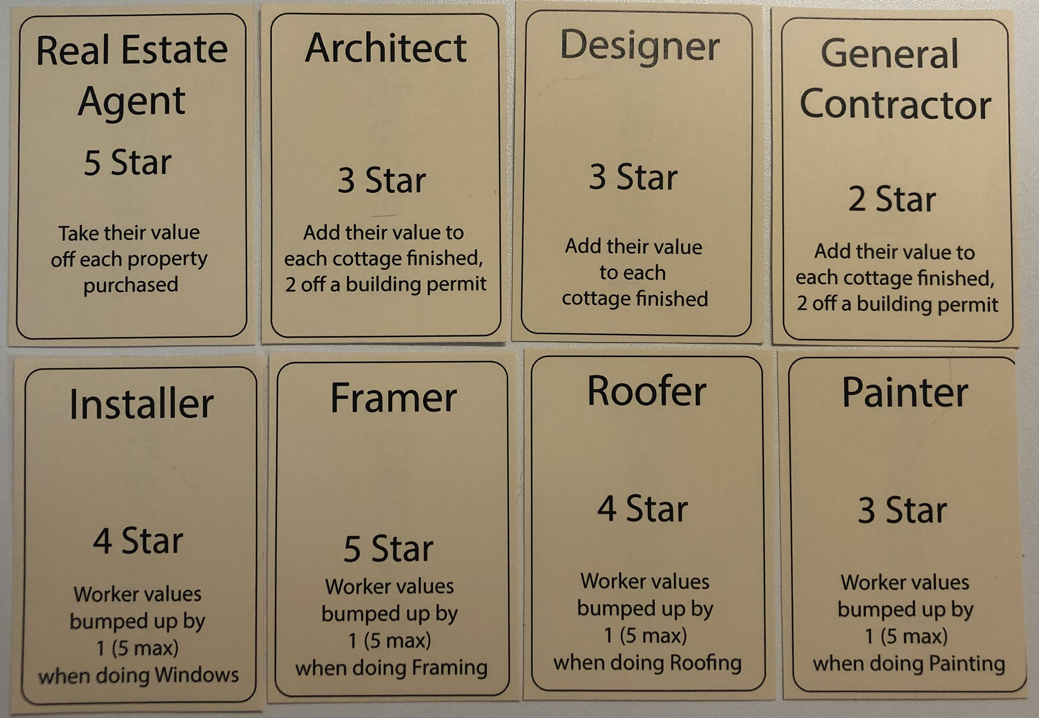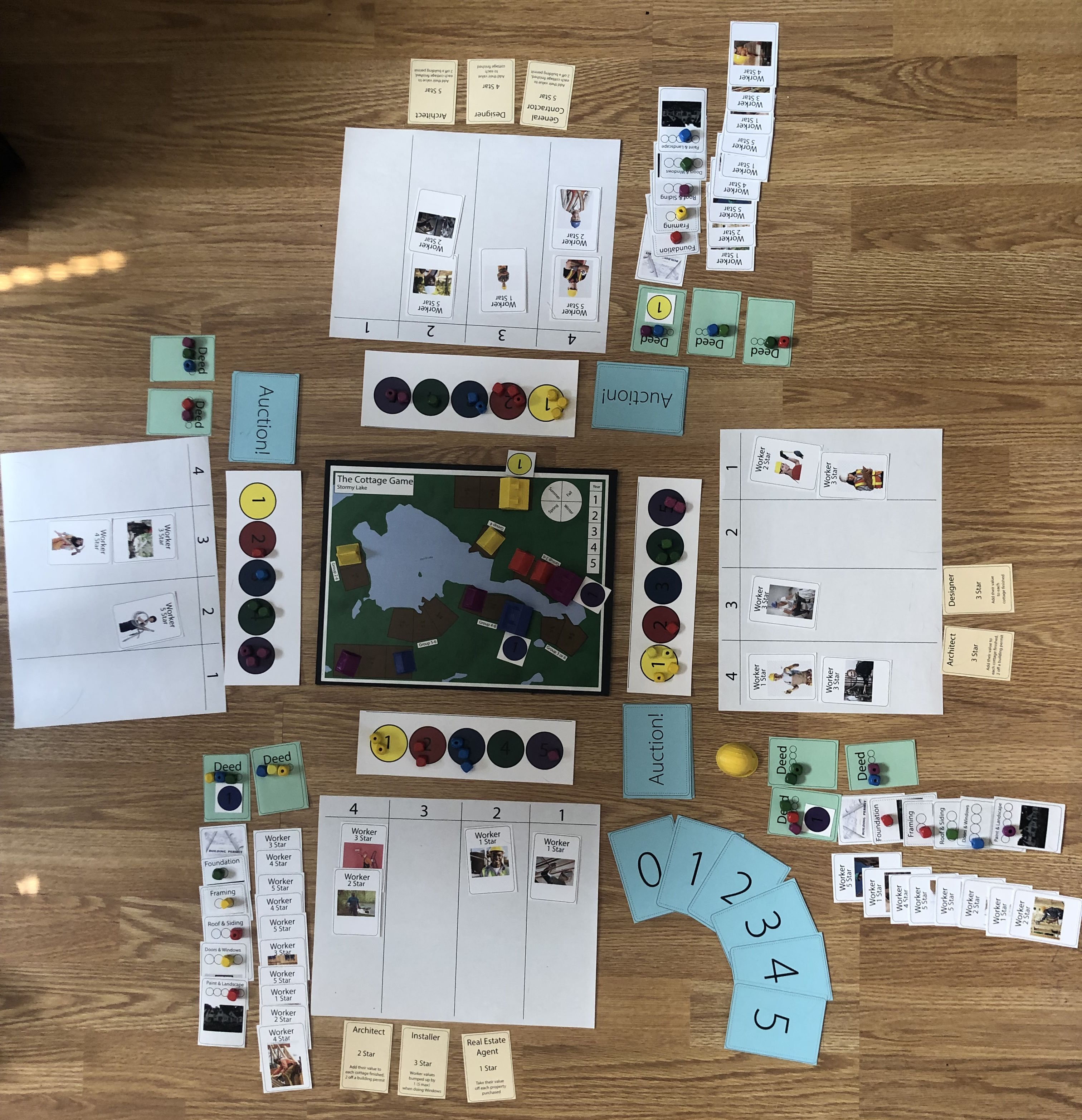 Players start their new construction business with an amount of money and start by hiring workers, specialists and buying property. Once they have some land, they can start building their cottage(s), 1 level at a time until completed. They have to balance the hiring out of workers they employ, to generate income, with assigning them to actually do the actual building, all while competing with the other players to be the richest cottage builder.