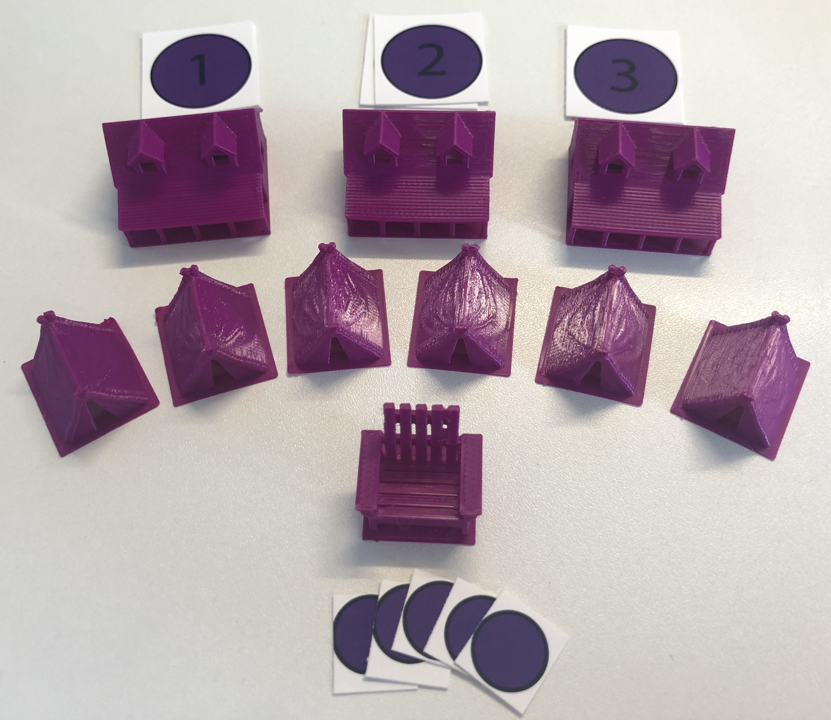 Players' pieces (3 cottages, 6 tents (for property ownership), muskoka chair for the Victory Point track and markers for awards: